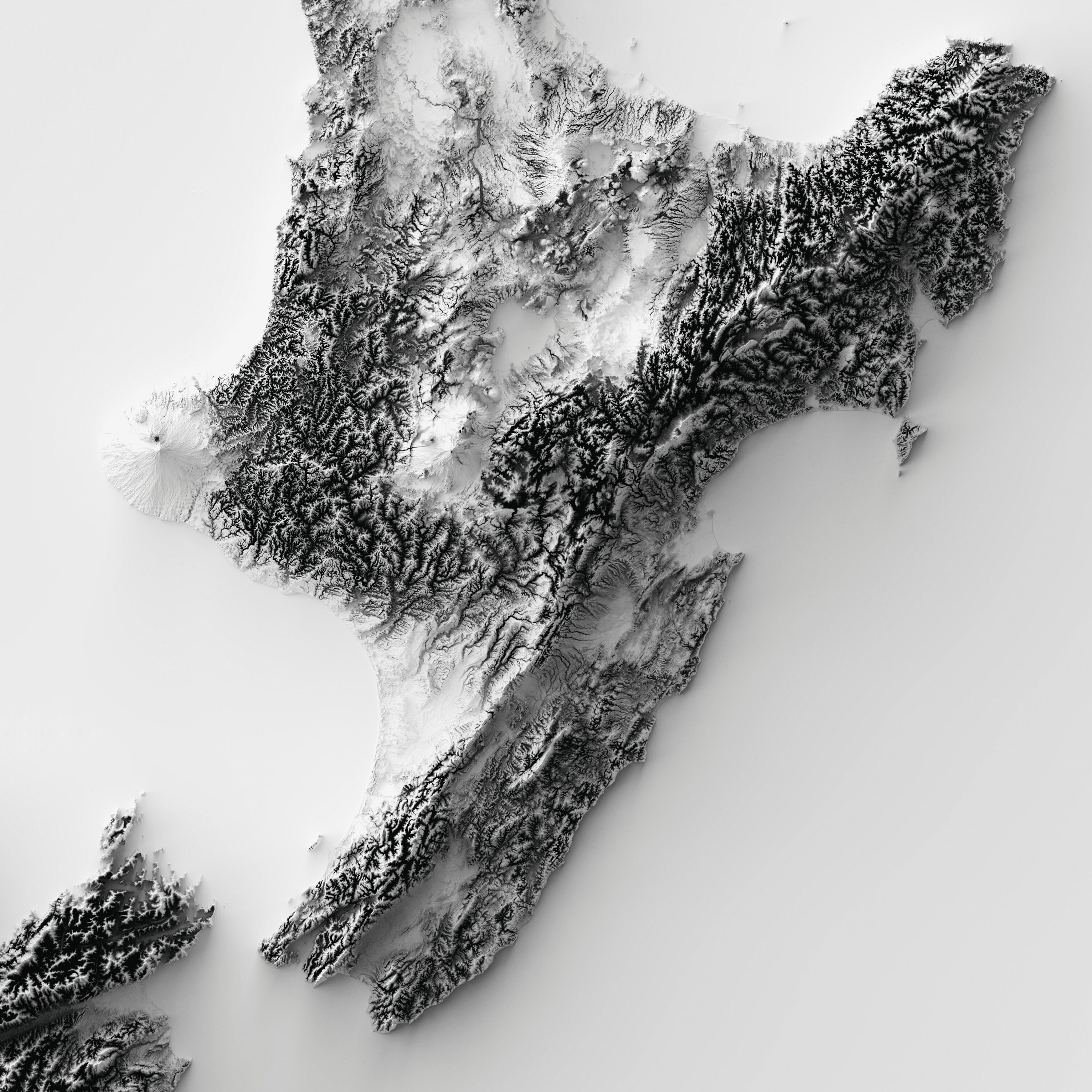 New Zealand 3d Map . Flat areas are smooth on the map, areas with steep slopes and mountains appear more rough It works at all scales, from a national to property level
